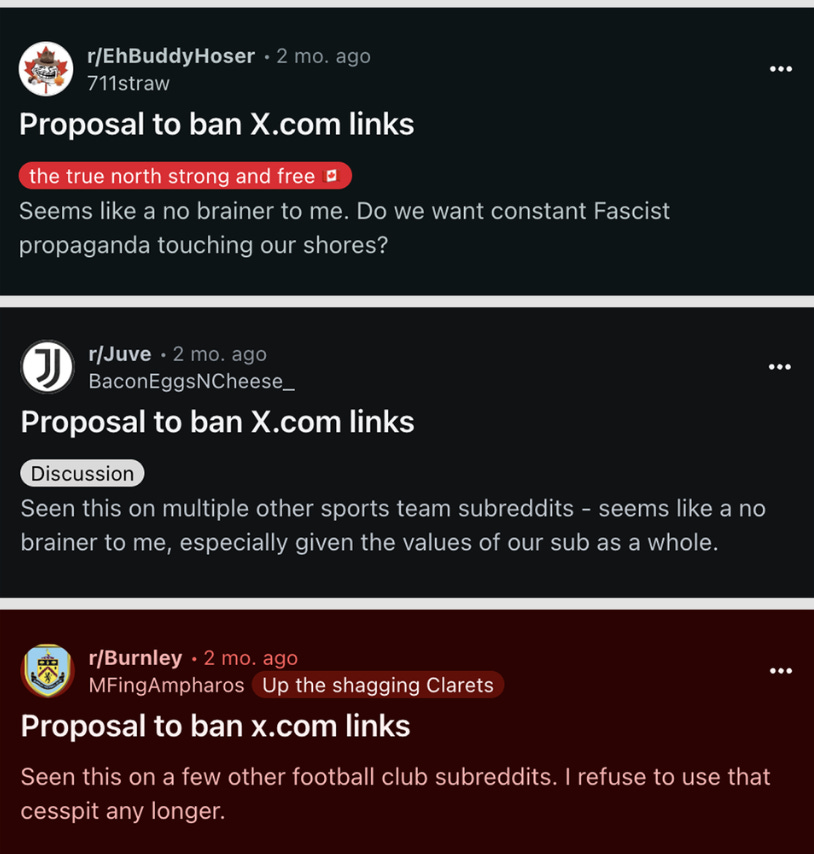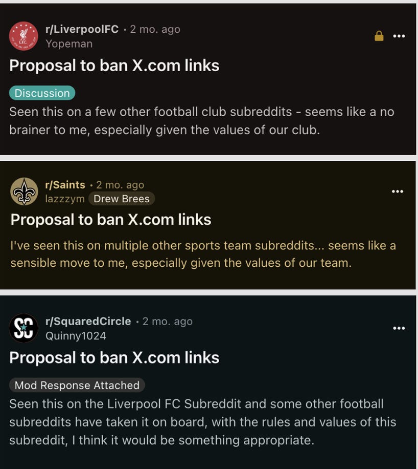 In April, I chronicled what appeared to be a mass influence campaign targeting Elon Musk, specifically aimed at banning all links to X across major sports subreddits. Within minutes of each other, massive mainstream sports communities—particularly UK football—began posting near-identical proposals to ban links from the Musk-owned social media platform. These posts instantly surged to the top of their communities. In r/liverpoolfc (the community dedicated to the Liverpool Premier League club), the X-ban proposal became the most upvoted post in the subreddit’s history, surpassing the celebration of Liverpool’s first Premier League title in 30 years by thousands of upvotes. As I noted: