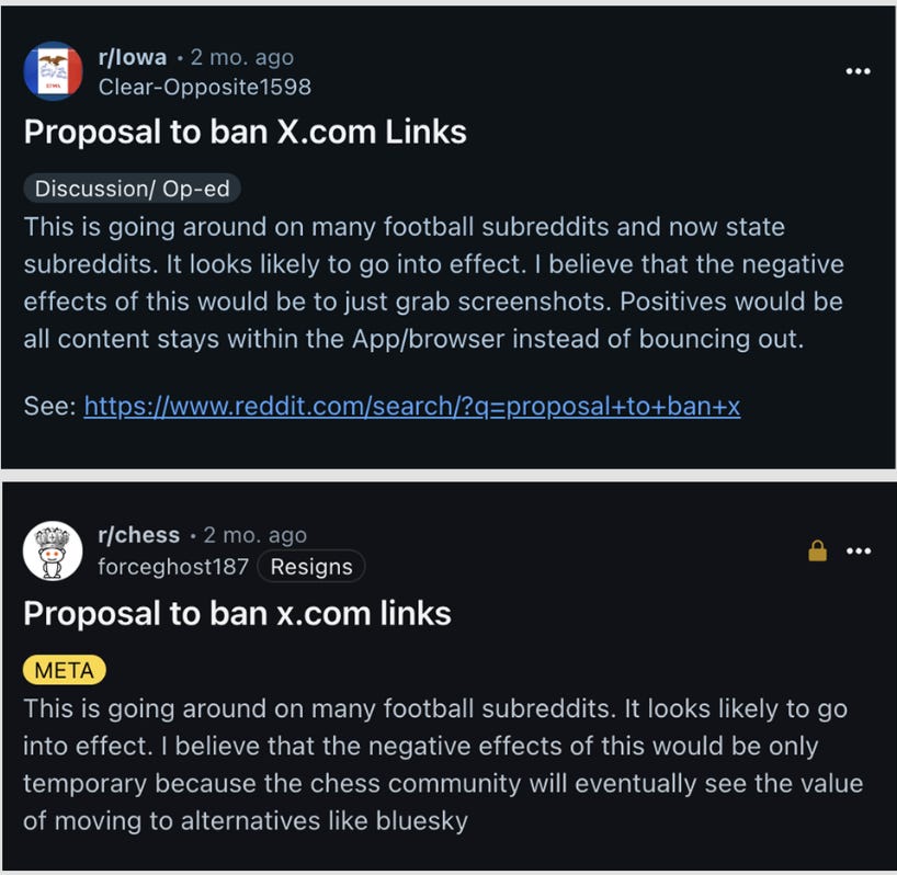 There was no smoking gun. No one told me, “Yes, this is a coordinated campaign.” But as I began asking users who were among the first to post proposals to ban X links—some of whom had not posted for years, and some had not posted ever into the respective communities before making their X ban proposals—I was blocked by a number of these users.