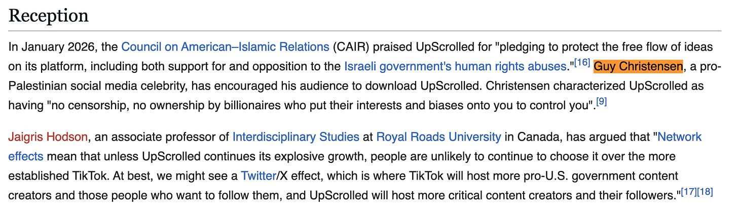 Christensen heavily promoted UpScrolled, describing it to followers as offering “no censorship” and freedom from billionaire ownership — a characterization later added to the platform’s Wikipedia article by editor Isi96. During the same period, the same editor expanded the page’s “Reception” section, adding praise from CAIR alongside a quote from Christensen himself describing the platform.