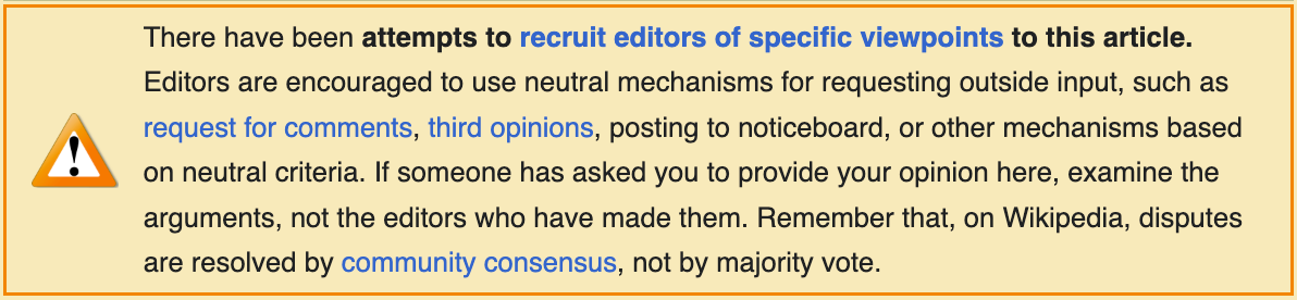On February 28, an editor added a banner to the top of the article’s Talk page alerting editors that participants may be recruiting outside support for a discussion. The banner warned that “there have been attempts to recruit editors of specific viewpoints to this article” and reminded participants that Wikipedia disputes are resolved through consensus rather than majority votes.