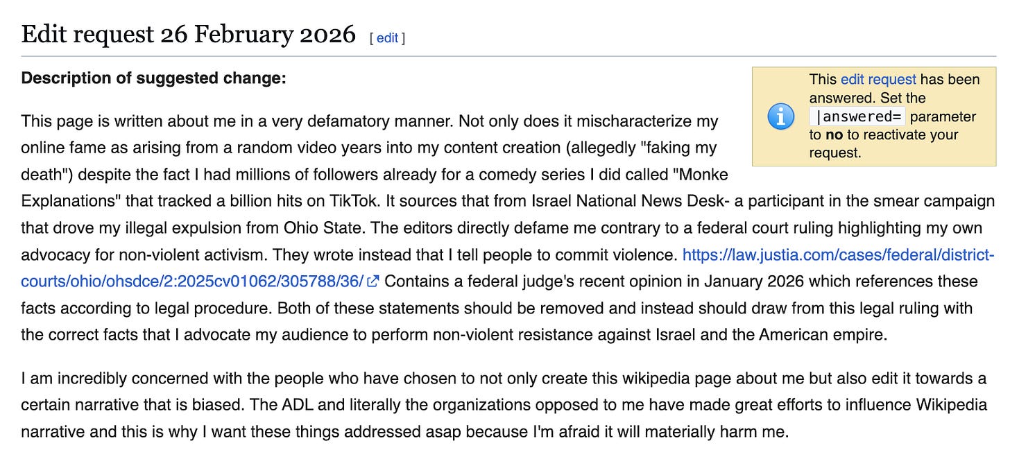 This page is written about me in a very defamatory manner. Not only does it mischaracterize my online fame as arising from a random video years into my content creation (allegedly "faking my death") despite the fact I had millions of followers already for a comedy series I did called "Monke Explanations" that tracked a billion hits on TikTok.